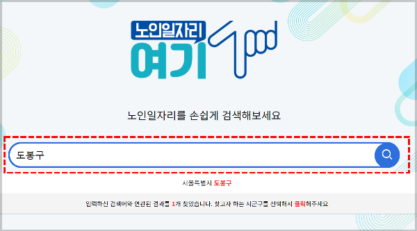 노인일자리 여기 홈페이지에 접속하면 바로 첫 화면에 지역구를 검색하는 검색창이 보입니다. 여기에 내가 사는 지역구를 검색합니다. 예를 들어 저는 '도봉구'를 검색했습니다. 검색 결과에 나온 서울특별시 도봉구를 선택합니다.
