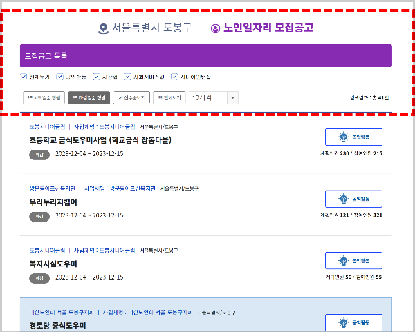 공익활동은 모두 마감된 공고라 위 검색 항목에서 '접수중 보기'를 클릭하니 현재 도봉구에서는 접수 중인 노인일자리 공고가 없는 것으로 확인되었습니다.