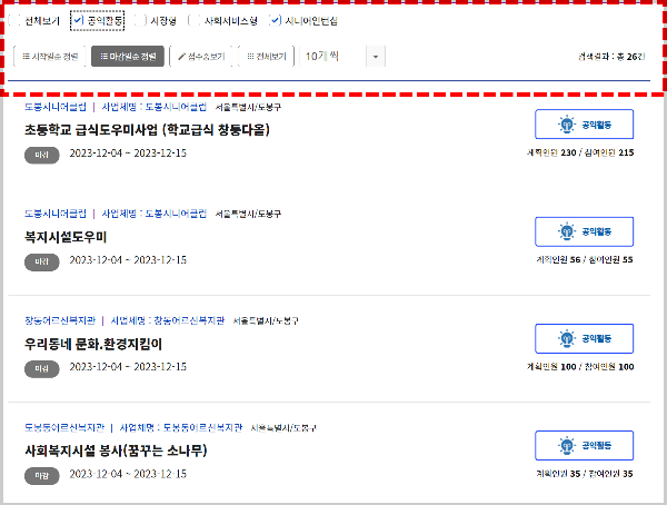 공익활동만 체크하여 다시 검색하니 결과가 26건이 나왔으며 초등학교 급식도우미나 복지시설도우미 등의 공고를 확인할 수 있습니다. 각 공고 제목의 하단을 보면 접수 중, 마감을 확인할 수 있으며 우측을 보면 참여인원과 계획인원을 알 수 있습니다.