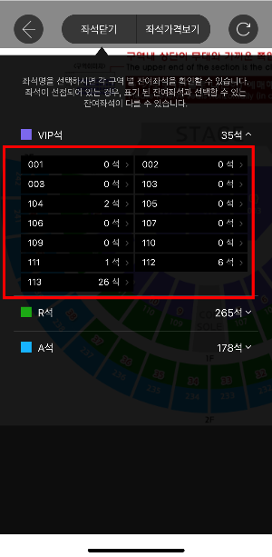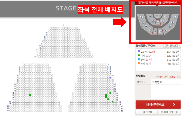 ✔ 공연장 좌석 배치도를 확인한 후 잔여좌석보기를 눌러 잔여석 정보를 체크합니다.