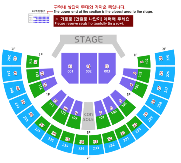 ✔ 원하는 구역을 선택한 후 색깔이 표시된 잔여좌석 중 원하는 좌석을 선택합니다.